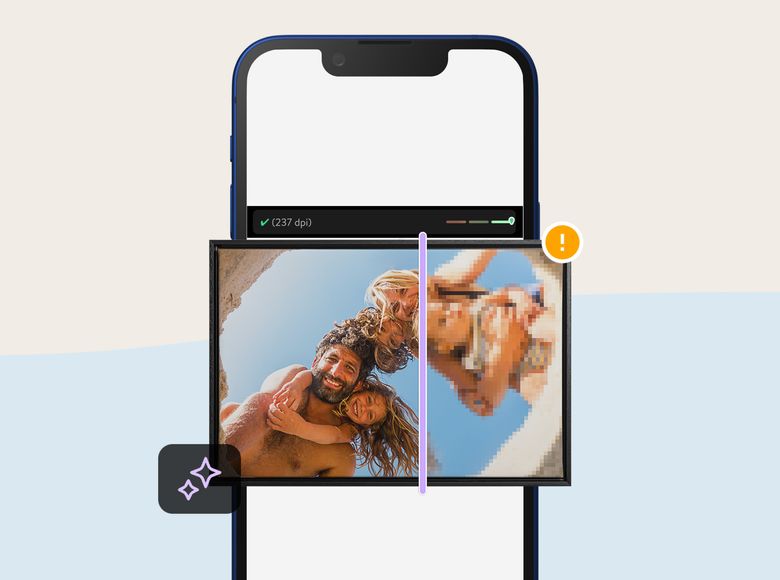 Fixa till dina lågupplösta bilder. Vårt AI-verktyg förbättrar bildkvaliteten och reducerar pixling för att visa upp din väggdekoration från dess absolut bästa sida i tryck.