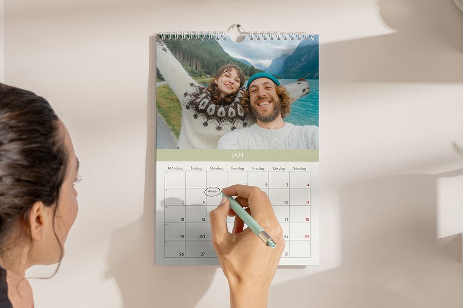 Fundera på hur du vill organisera dig. Vill du snabbt kolla ett datum? Prova en skrivbordskalender med träställ eller en kalender i liggande format. Vill du skriva ner allt? Välj en A3-porträtt – den största storleken och lätt att ta ner och hänga upp igen. Behöver du ha koll på allas scheman? Våra familjeplanerare har kolumner för varje person. Fundera på och bläddra – en perfekt personlig fotokalender börjar här.