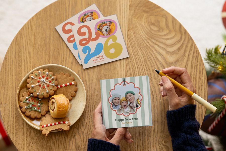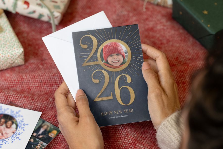 Vårt bästa tips till julkortets framsida: Har du stora nyheter att berätta i år? Använd det här nyårskortet för att dela stora nyheter som bröllop, tillökning eller andra spännande planer inför 2026 och sätt personlig prägel på högtidshälsningen.