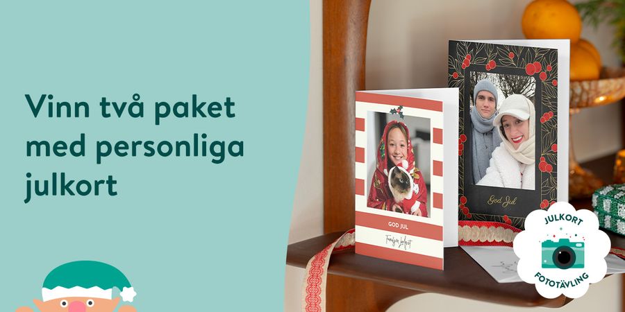 Vi sprider extra glädje den här julen – de 20 lyckliga vinnarna får två paket med sina personliga julkort som vi skapar, trycker och levererar (på vår bekostnad). Dessutom lägger vi till en presentkupong på 500 kr Önskefoto för att kickstarta din julshopping.