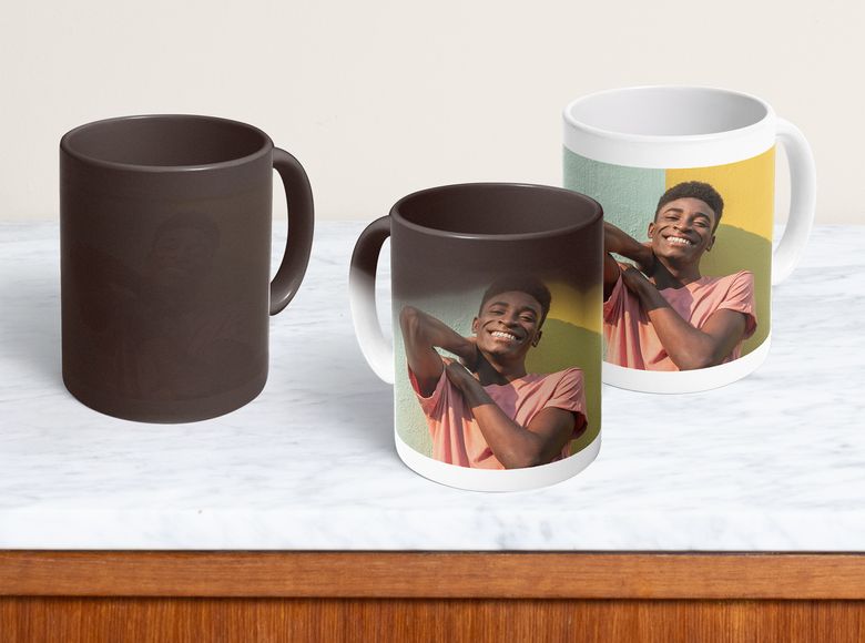 Magic.. (Well, almost.) Our personalised magic mugs are coated with thermochromic ink, a heat-sensitive layer that changes colour when you pour in hot liquid. That’s when your hidden photo mug design appears making every tea or coffee a little surprise reveal.