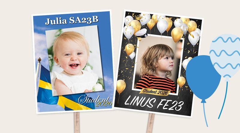 Studentskylten är en viktig del av studentfirandet. När studenten tillsammans med sina kamrater rusar ut från skolan kan hen lokalisera sin skylt och snabbt hitta familj och vänner i folkvimlet. Studentskylten följer sedan med hela dagen och blir till ett fint minne från en av de största dagarna i en ungdoms liv. Studentplakat hos önskefoto: Skapa enkelt ditt plakat i vårt verktyg direkt på nätet. Ladda helt enkelt upp den bild du vill använda, bestäm utformning och vad som ska stå på skylten. Du får sedan allt levererat till dig. Har du en pappersbild? Då kan du enkelt digitalisera din bild genom att scanna bilden via en traditionell scanner eller ladda ner en mobilscanner app. Hos önskefoto hittar du även studentnallar som är fina att hänga runt halsen, banderoller som man kan hänga hemma, inbjudningskort till studentfesten och visselpipor så studenten kan föra det oväsen som firandet kräver. Allt för den perfekta studentfesten!